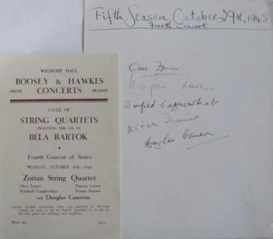 Programme: single sheet. Programme included Bartok's fourth string quartet and Schubert's string quintet in C major. With a separate sheet of signatures of all the performers: Olive Zorian, Marjorie Lavers, Winifred Copperwheat, Norina Semino and Douglas Cameron. |