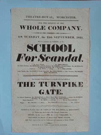 Theatre Royal, Worcester, for the benefit of the whole company: Tuesday, the 25th September 1821, the Comedy of the School For Scandal ... to conclude with the farce of The Turnpike Gate. |