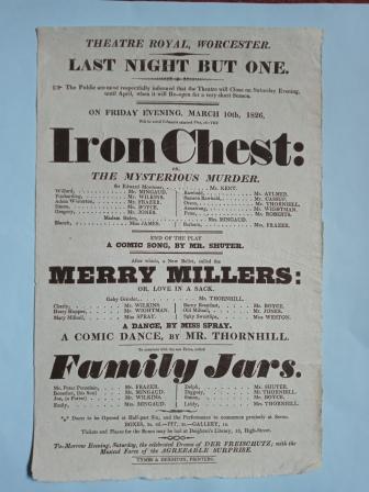 Theatre Royal, Worcester, last night but one: Friday evening, March 10th, 1826, Colman's Admired Play of The Iron Chest, or The Mysterious Murder ... after which a New Ballet called the Merry Millers, or Love in a Sack. |